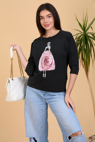 Джемпер женский с 3D принтом, круглая горловина обработана обтачкой, спущенная пройма, рукав 3/4. На спинке кокетка, низ спинки слегка удлинён.