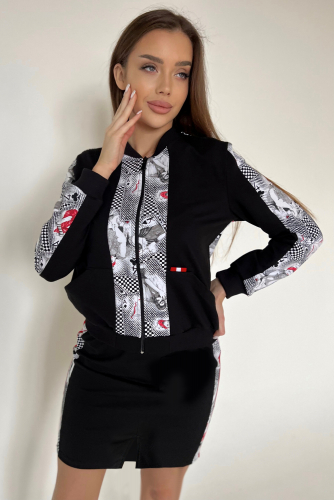 Джемпер с нежным принтом из футера с лайкрой 2-х нитка. Горловина в виде лодочки обработана обтачкой, на спинке фигурный вырез декорирован бантом. Спущенная пройма, длинный рукав и низ джемпера обработаны широким манжетом. Модный и универсальный джемпер отлично впишется как в офисный, так в повседневный и даже в романтический лук современной модницы.