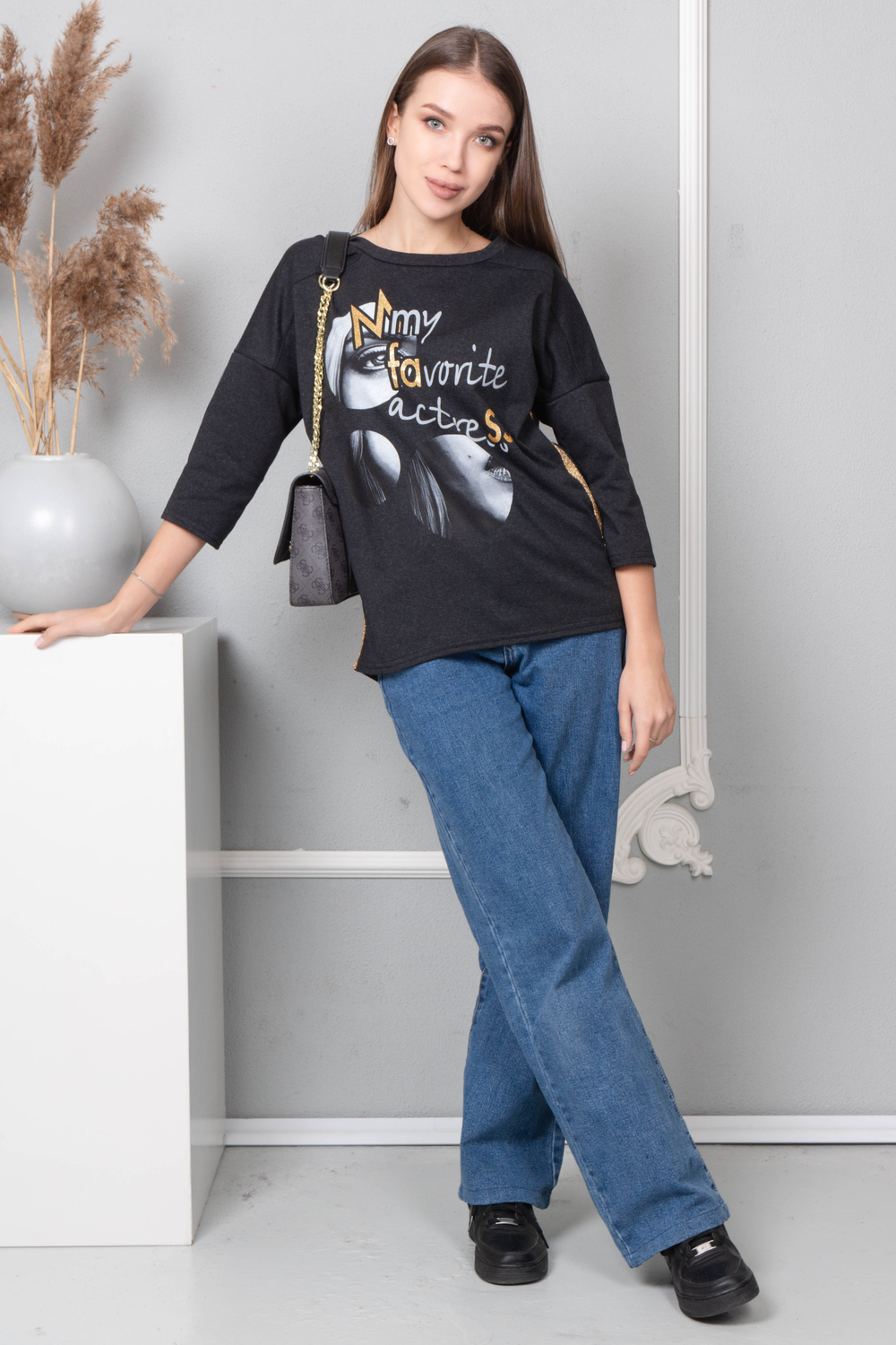 Джемпер из футера с лайкрой, круглая горловина обработана обтачкой, спущенная пройма, рукав 3/4. На спинке кокетка, низ спинки слегка удлинён и закруглён. Стильный принт и лампасы по боковым швам придают джемперу некую изюминку. Тёплый, комфортный джемпер для девушек любой фигуры и возраста