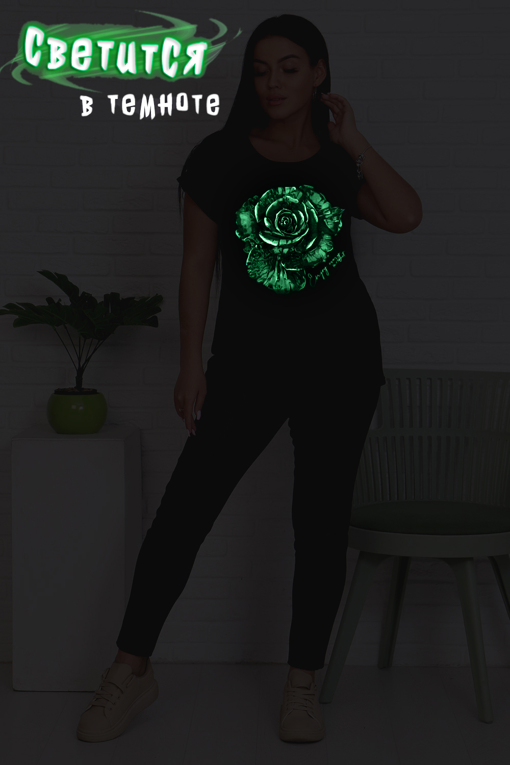 Футболка женская прямого силуэта со светящимся в темноте ярким принтом. Горловина круглая, рукав цельнокроеный с отворотами по низу. Удобная, практичная, лёгкая футболка не стесняет движения. Выполнена из 100% хлопка. Светящееся покрытие - необычный декоративный материал, который привнесет в дизайн оригинальные нотки. Люминесцентная краска будет красиво светиться в темноте, подержав светящийся пигмент на солнце. В составе материала нет вредных компонентов, что делает изделие безопасным. Благодаря стильному дизайну футболка с оригинальным принтом отлично смотрится в тандеме с джинсами, шортами, кедами, кроссовками или ботинками. Отличный вариант на каждый день! В любое время года станет незаменимой и любимой вещью.