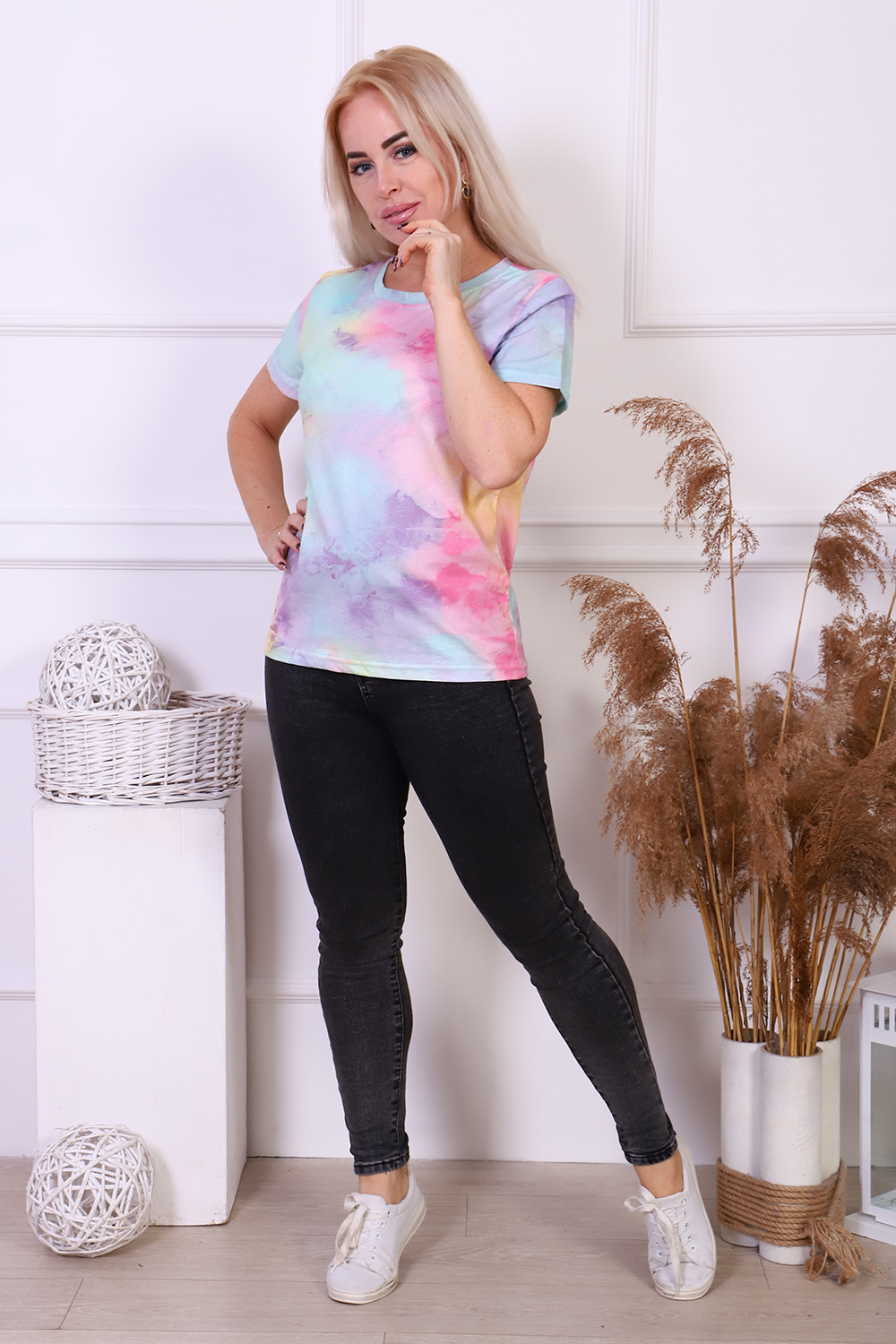 Футболка отличная. Брала на размер больше, чтоб посвободнее, но можно и вразмер. Не линяет, не вытягивается, ткань мягкая, приятная. Цвет не яркий, спокойный, но очень красивый.