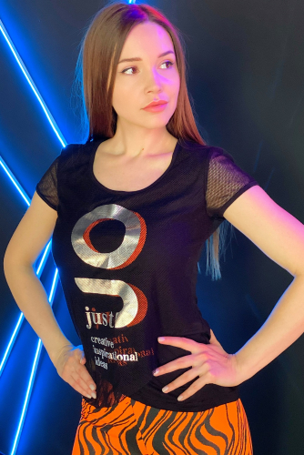 Футболка облегающая, с округлой горловиной, длиной выше талии. Рукав втачной, короткий. Горловина обработана бейкой из основного полотна.