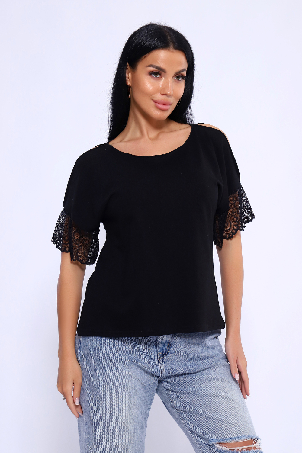 Футболка женская из гипоаллергенного хлопкового трикотажа - кулирки высокого качества пенье компакт. Модель слегка приталенного силуэта, горловина и спущенная пройма обработаны краёвкой, что придаёт футболке некую изюминку и индивидуальность. Пройма обработана широким, жаккардовым кружевом в виде короткого рукава. Стильная, комфортная футболка необходимая вещь для модницы любого возраста и фигуры, подойдет как для офисного гардероба так и для отдыха, активного занятия спортом.
