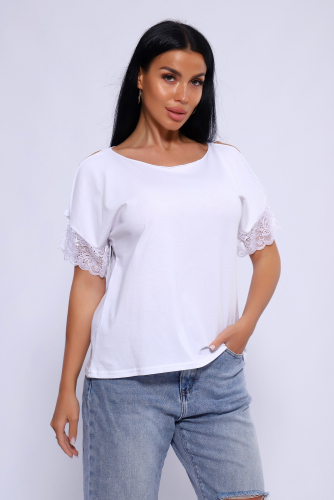 Футболка женская из кулирка с лайкрой высокого качества пенье. Модель с коротким реглан-рукавом, декорированным жаккардовым кружевом с фестонами по передней и задней полочке реглана, что создаёт вид слегка открытого плеча. Круглая горловина обработана планкой, рукав и низ футболки на широком манжете. Стильная, футболка - это базовая вещь для создания модного образа, актуальный вариант для торжественных и фуршетных мероприятий, а также на 1 сентября и повседневоной школьной формы.
