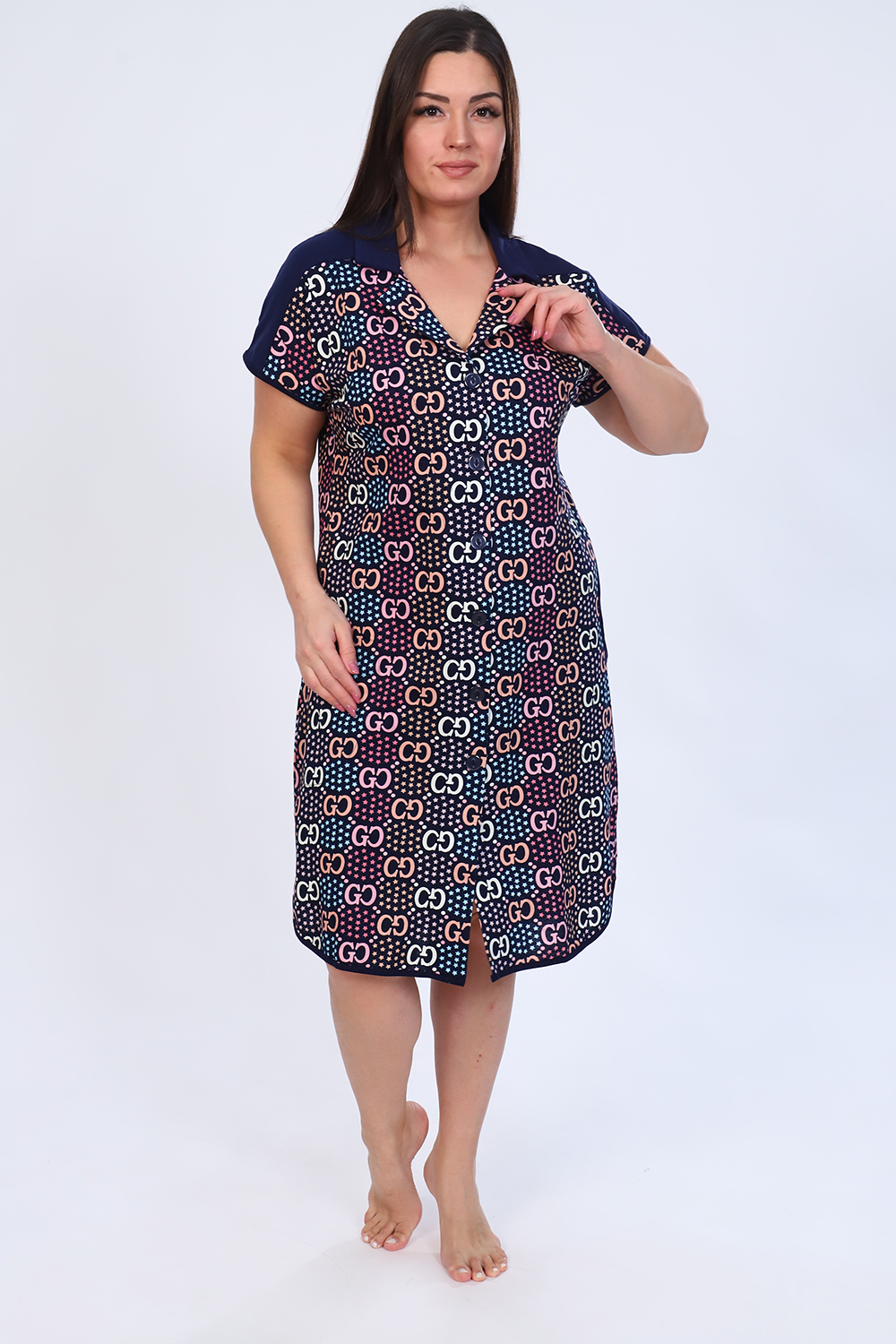 Халат-рубашка на пуговицах с коротким рукавом. В боковых швах глубокие карманы. Халат на пуговицах станет вашей любимой одеждой для дома и отдыха. В меру свободная модель трикотажного халата подойдет беременным и кормящим мамам, пуговицы, в отличие от молнии можно расстегнуть в нужных местах, что так важно при грудном вскармливании. Яркая расцветка халата на пуговицах будет к лицу как девочке-подростку, так и женщине с любым размером одежды