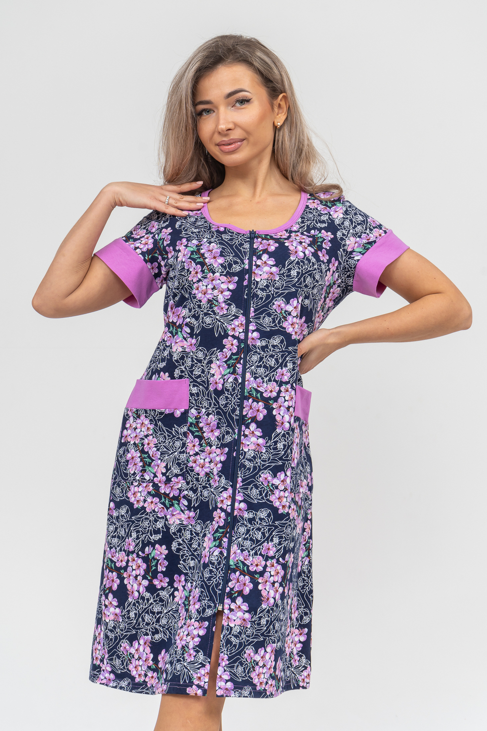 Женский халатик на молнии самая распространенная и универсальная одежда для домашнего отдыха и хозяйственных хлопот. После трудного рабочего дня, приходя домой, первым делом хочется переодеться. И данная модель это идеальный вариант среди представительниц прекрасной половины человечества. Модель выполнена из 100% хлопчатобумажной ткани. Халат так же дополняет яркая отделка по рукавам и карманам. А пояс на линии талии поможет легко смоделировать женственный силуэт и при этом Вы будете чувствовать себя легко и непринуждённо. Данная модель прекрасно подойдёт для дома, дачи и отдыха, создавая по-настоящему яркий образ и хорошее настроение! Рост модели на фото 165см.