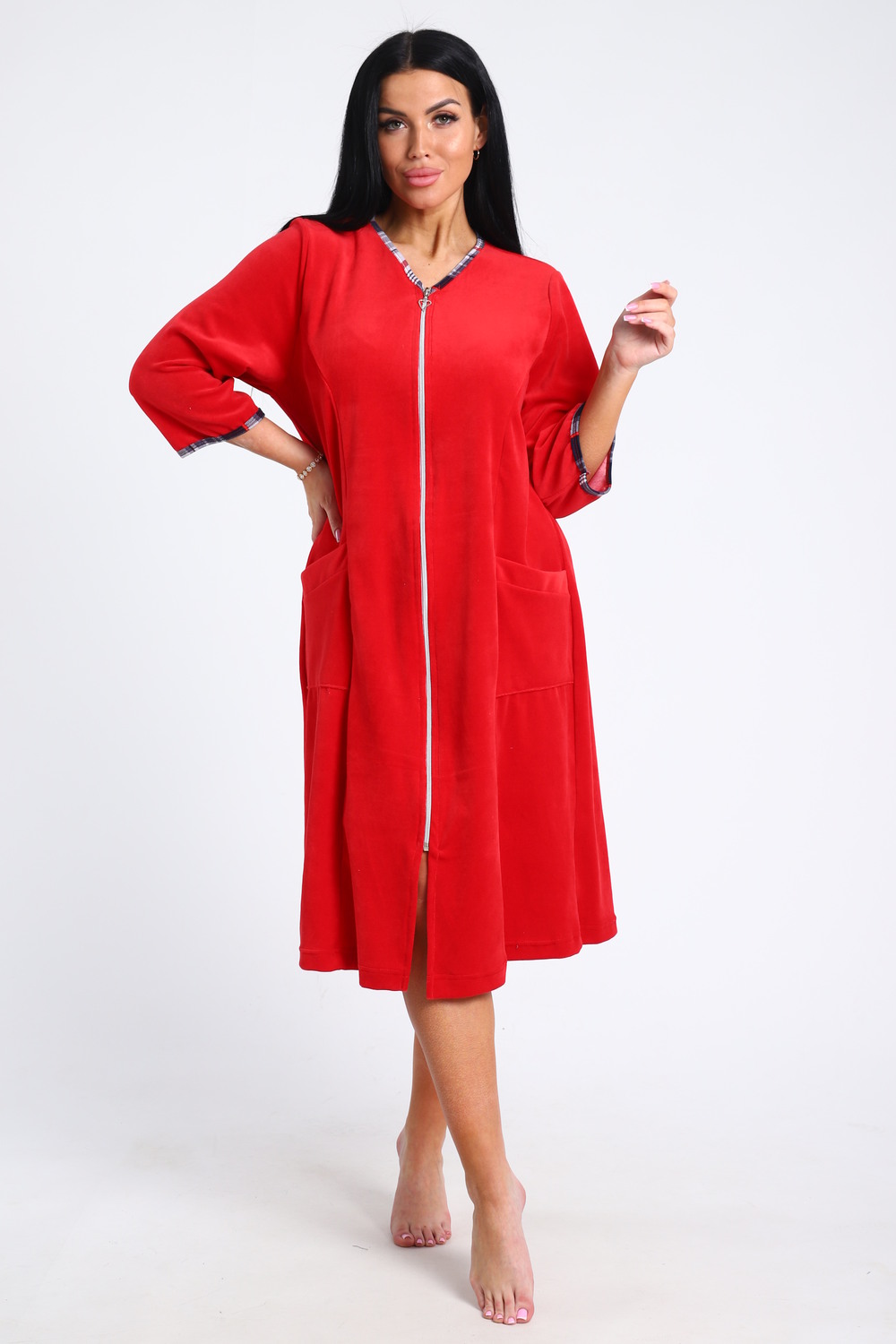 Халат женский велюровый, однотонный. По переду рельефы в рельефах карманы. Халат на молнии горловина уголком. Обработан халат под окантовку, длина ниже колена.