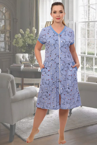 Халат женский на молнии. Короткий рукав, с карманами, отделка контрастной тканью на рукавах, горловине и карманах. Декоративная молния, на талии подрез