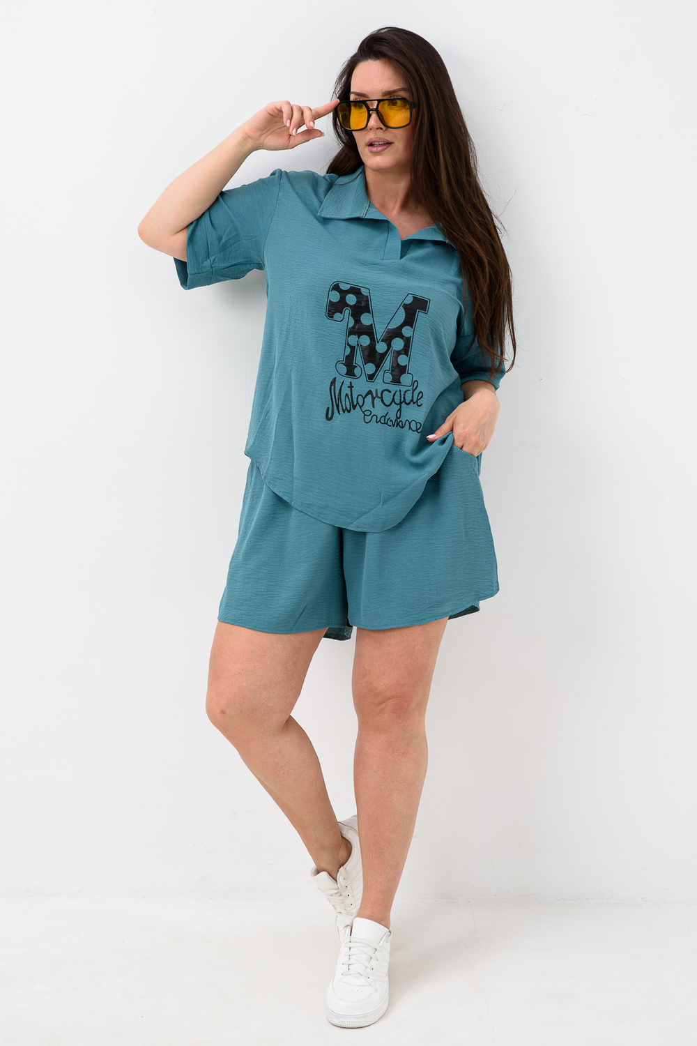 Представляем вам новинку - женский костюм-двойка, состоящий из футболки и шорт. Наряд состоит из свободной футболки-рубашки с однотонным принтом и шорт свободного кроя на резинке. Для удобства шорты имеют 2 кармана.