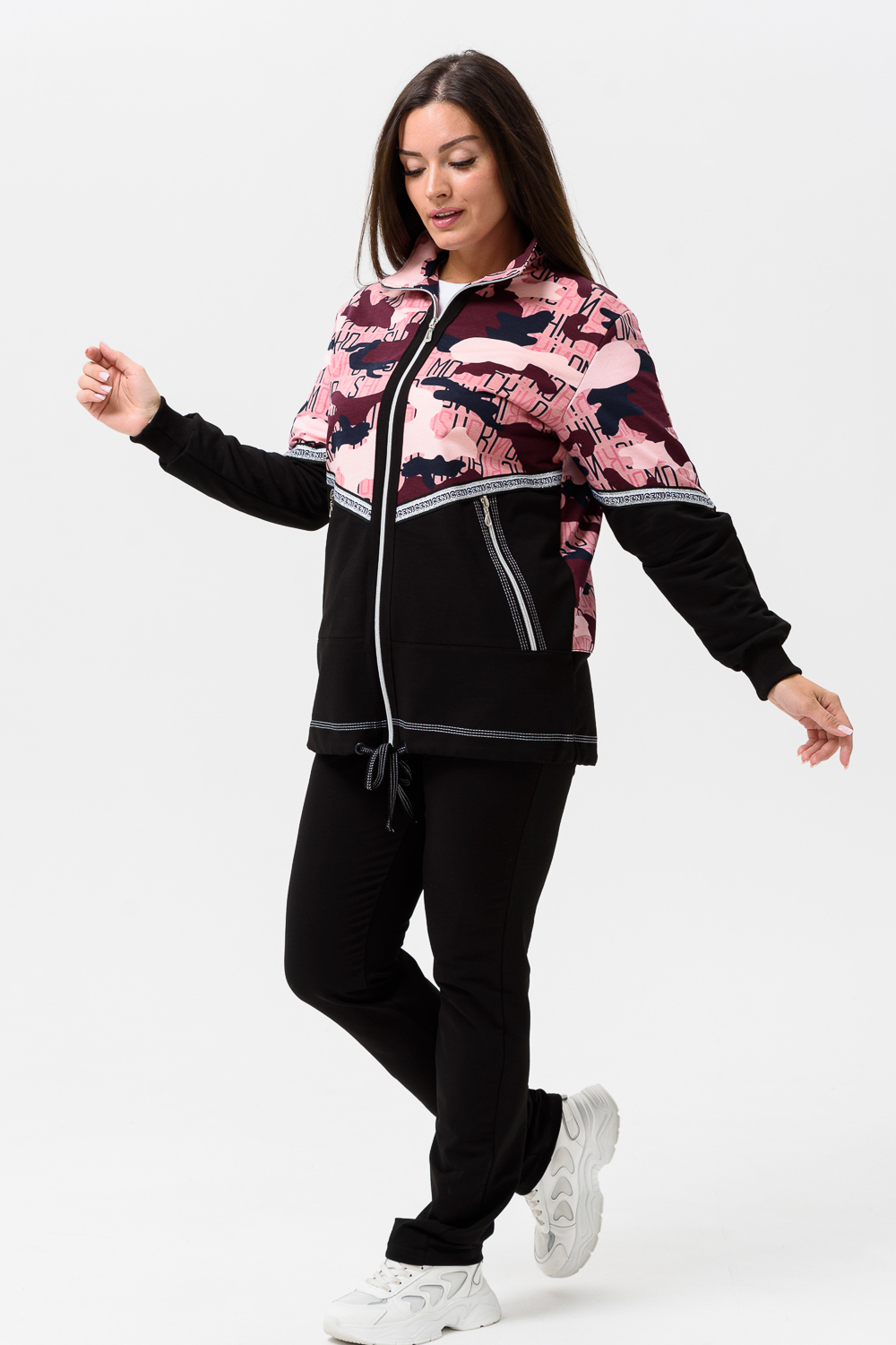 Костюм женский куртка и брюки. Куртка прямого силуэта с втачным рукавом на манжете из кашкорсе. Застежка на тесьму-молнию. Верхние части куртки и верхние части рукавов из набивной ткани с космическим принтом. Воротник-стойка. Нижняя часть полочки и спинки из однотонной ткани затягивается шнуром. На полочке карманы на молнии. Брюки прямые, слегка зауженные к низу