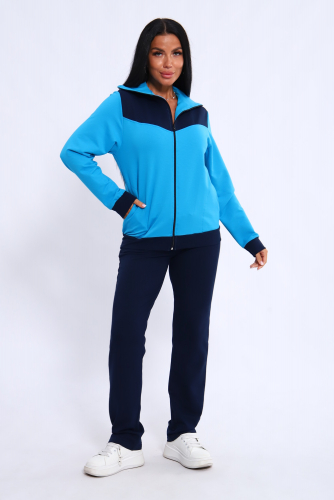 Спортивный женский костюм из эластичного футера. Кофта прямого силуэта на молнии с воротником - стойка, рукав втачной, по бокам карманы, на поясе манжет. Брюки классического кроя без карманов на притачном поясе.