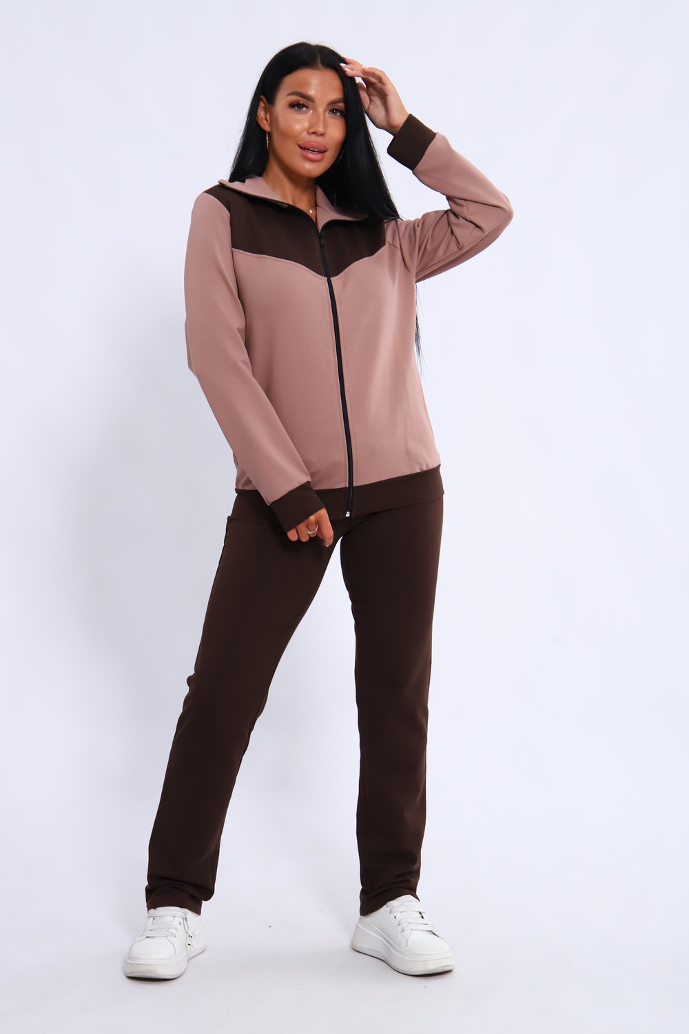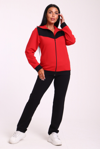 Спортивный женский костюм из эластичного футера. Кофта прямого силуэта на молнии с воротником - стойка, рукав втачной, по бокам карманы, на поясе манжет. Брюки классического кроя без карманов на притачном поясе.