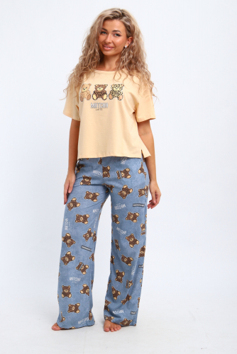 Костюм состоит из свободных прямых брюк и футболки. Футболка свободного кроя со спущенным плечом.