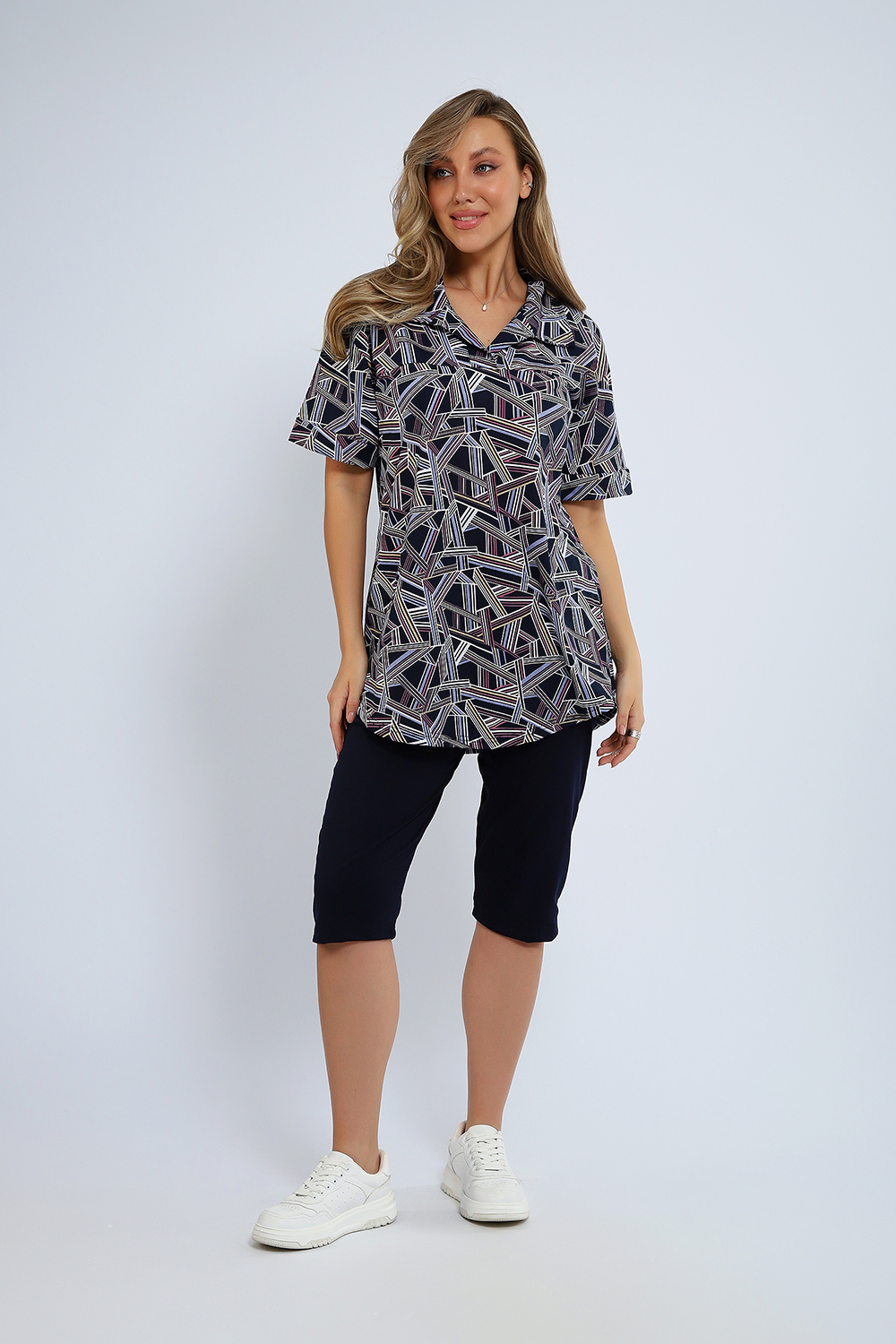 Костюм состоит из туники и бридж. Туника с рубашечным воротником, полукруглым низом и короткими рукавами. Бриджи с карманами.