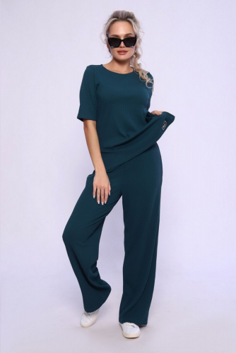 Костюм состоит из кофты и брюк. Кофта свободного кроя с длинными расклешенными рукавами. Брюки свободные прямые с карманами.