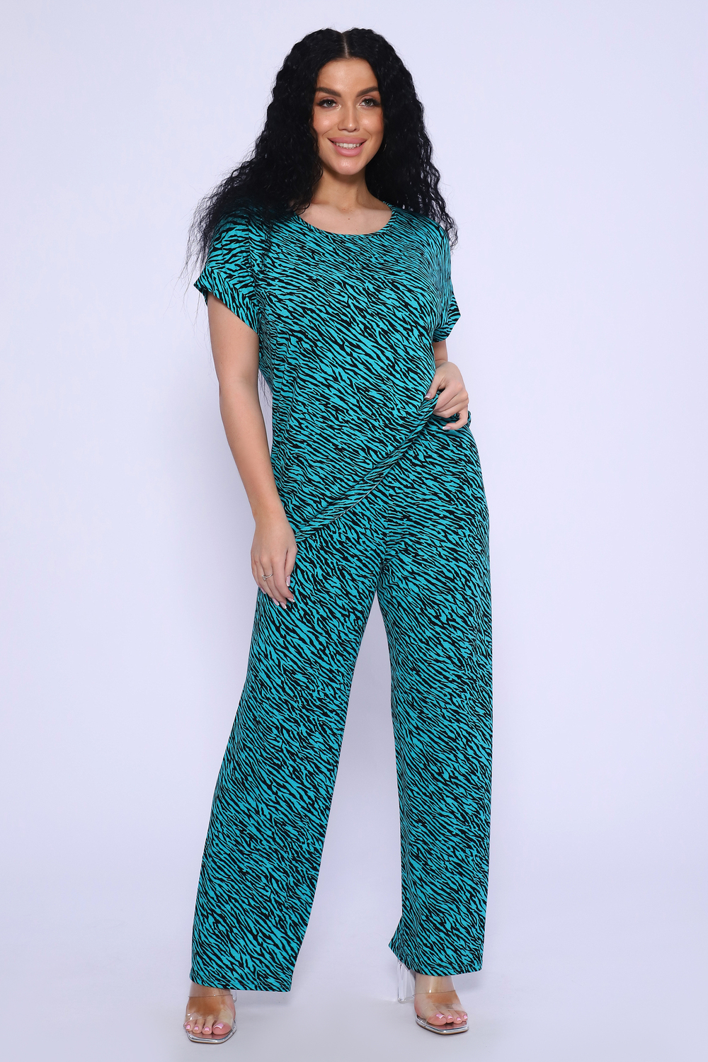 Модель свободного силуэта - легкий, яркий брючный костюм украсит как повседневный, так и офисный гардероб. Блузка полуприлегающего силуэта со спущенным рукавом на манжете, не сковывает движений, а широкие брюки палаццо на эластичном поясе-резинке так же свободны на фигуре. Костюм прекрасно будет смотреться на девушках и женщинах любой комплекции, не полнит, при желании можно подчеркнуть талию любым ремешком. Модель изготовлена из дышащей трикотажной ткани вискоза, которая очень приятна к телу, не мнётся, универсальна и актуальна!