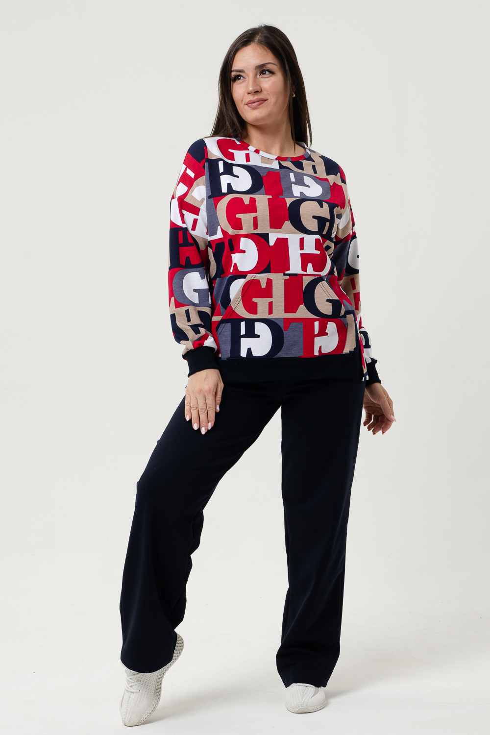 Костюм женский с брюками. На толстовке карман-кенгуру, боковой шов плавно переходит на перед, внизу которого небольшие разрезы, по переду внизу пояс. Горловина овальной формы, обработана небольшой бейкой. Брюки трубы с удобной посадкой, в боковых швах внутренние карманы. Костюм отлично подходит как для дома, так и для носки под верхнюю одежду.