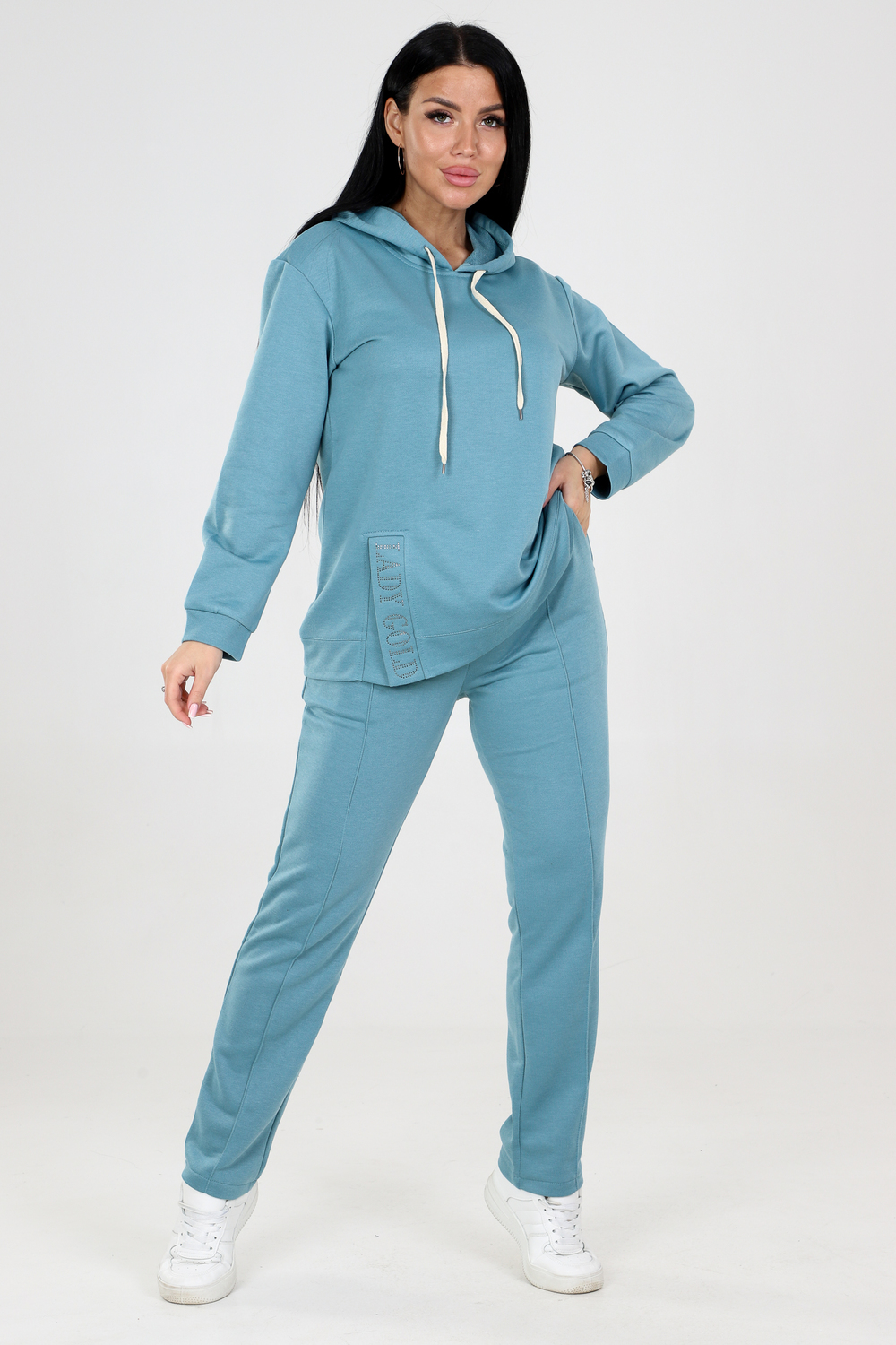 Туника с капюшоном. Разрез туники оформлен стразами, придающими блеск и привлекательность. Это прекрасная деталь, которая подчеркнет вашу индивидуальность и притянет взгляды окружающих. Брюки этого костюма оснащены резинкой, что обеспечивает идеальную посадку и комфорт в носке. Вы будете ощущать себя уверенно и свободно, благодаря оптимальной посадке брюк.