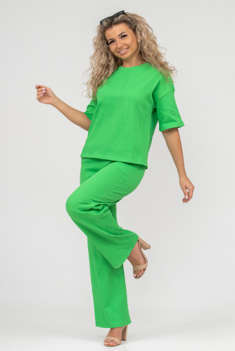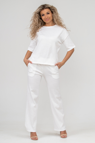 Модный стильный костюм - идеальное решение для тех, кто ищет лёгкую и красивую одежду на каждый день. Костюм, футболка и брюки, выполнен из кулирки гипе жатка компакт. Жатка - это ткань с мятой структурой, декоративными заломами и складками. Имеет много положительных качеств: хорошо тянется, упругая, красивая текстура, неприхотливая в уходе, прочная, износостойкая, не мнётся, не нуждается в глажке и приятная к телу. Футболка выполнена со спущенным рукавом, отстроченной обтачкой по горловине и двумя небольшими разрезами по бокам. На брюках имеется два вместительных боковых кармана и пояс, обработанный на специализированной поясной машине. Данная модель костюма очень удобна в качестве повседневной одежды, а универсальный фасон хорошо скроет недостатки и подчеркнет достоинства фигуры. Свободный крой комплекта двойки не сковывает движения, что делает его очень удобным в носке, резинка не перекручивается, а высокая посадка брюк - палаццо даёт ощущение комфорта. Такой костюм можно использовать как в качестве костюма для фитнеса, так и как вариант домашнего костюма, в нем также можно поехать на дачу или отправиться на вечернюю прогулку. Однотонный дизайн летнего брючного костюма без принта, надписей и декоративных элементов будет гармонировать с любым стилем одежды, а дополнить образ с модным костюмчиком можно любимыми аксессуарами и украшениями. Свободную футболку и брючки можно носить как вместе, так и отдельно. Футболку с коротким рукавом и разрезами по бокам можно легко сочетать с джинсами, юбками и шортами. К брюкам с карманами можно также подобрать любой верх. Образ с костюмом можно дополнить кроссовками, кедами или туфлями. Мягкий, прочный, хлопковый материал не дает усадку, не теряет форму после стирки и не линяет, его можно стирать в режиме бережной стирки при 30 градусах. Также данный трикотажный костюм не скатывается и не вытягивается за счет небольшого количества полиэстера в составе. Такой однотонный костюм с широкими брюками подойдет для разной возрастной категории. Он идеально подойдет для беременных и мам с детьми. Хорошо сядет на высоких и невысоких представительницах прекрасного пола всех возрастов. Такой универсальный прогулочный женский костюм станет отличным подарочным вариантом, его можно подарить маме, дочери, жене, бабушке, подруге или порадовать себя любимую даже без повода. Наш костюм благодаря своей практичности и лаконичному дизайну будет служить Вам долгие годы.