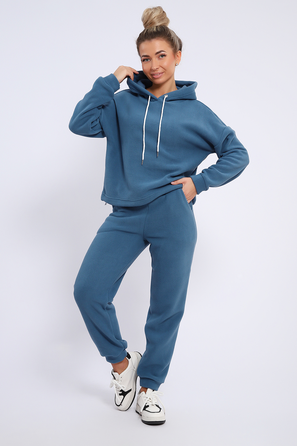 Женский костюм выполнен из флиса высокого качества. Флис - ткань с ворсистой поверхностью, что позволяет эффективно сохранять тепло. Материал прочный, эластичный, влагостойкий. Хорошо пропускает влагу, при этом не впитывает ее. По теплостойкости превосходит шерсть, но намного легче. Воздухопроницаемая гигроскопичная ткань создает для тела комфортный микроклимат. Материал гипоаллергенный, подходит для изготовления одежды детям, в том числе новорожденным. Изделия из флиса легкие, не мнутся, не деформируются, не вытягиваются.В такой одежде удобно и комфортно. Эластичность материала позволяет легко двигаться. Костюм состоит из толстовки и брюк. Толстовка с капюшоном и шнурком. Линия плеча спущена, длинный рукав. По низу толстовки имеется резинка с фиксатором, с помощью которой Вы можете собрать изделие как вам хочется и нравится. Брюки представлены с вместительными боковыми карманами. Манжеты брюк выполнены из основного материала, а пояс на специализированной поясной машине, что делает швы ровными и качественными. Свободный крой прекрасно будет смотреться на дамах с любыми формами. Костюм такого плана представлен в широкой размерной сетке, что позволяет выбрать его как девушке, так и женщине. Однотонный костюм модных расцветок будет удачным выбором для поездок в отпуск, на пикник, для школы, для активного отдыха и прогулок по городу. Будет гармонично сочетаться как с кроссовками, так и с ботинками. Используя эту модель в качестве домашнего костюма, Вы поймёте, что это именно тот самый идеальный вариант, в котором будете себя чувствовать удобно, комфортно и современно. Костюм с брюками - это настоящая находка для тех, кто ценит свою индивидуальность!