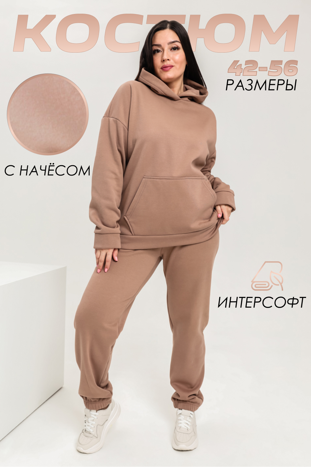 Костюм женский теплый из ткани интерсофт-начес. Толстовка костюма OVERSIZE с капюшоном и карманом кенгуру, брюки костюма с прорезными карманами и резинками внизу, резинка брюк прострочена на поясной пятиигольной машине. Идеальный вариант для холодной погоды.