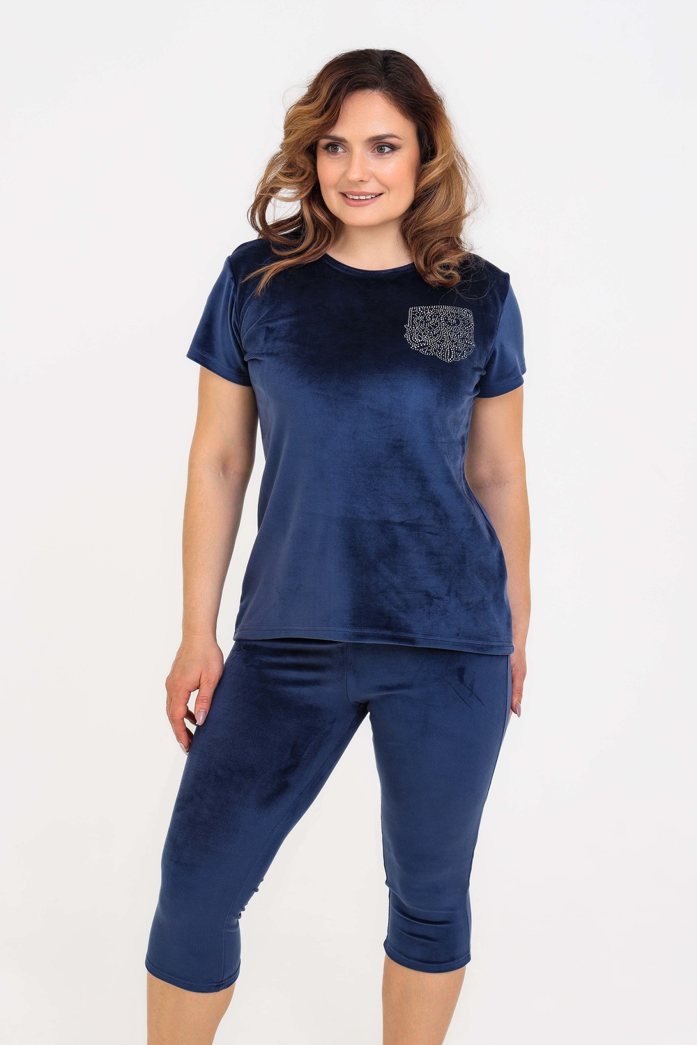 Костюм женский из велюра. В комплект входят:- футболка с коротким рукавом с округлым вырезом горловины и леггинсы. Мягкий трикотажный комплект для женщин Российского производства. Стильный костюм из стрейч - велюра для женщин представлен в широкой размерной сетке: от маленького 42 размера до 52 размера. Удобный домашний велюровый комплект не сковывает движений, что делает его универсальной одеждой, которая подойдет на любую фигуру как для худеньких, стройных, так и для пышных девушек и женщин. Костюм двойка женский подходит на любой рост: для высоких и для невысоких. Однотонный костюм с шортами выполнен в спокойных и практичных темных тонах. Бархатный комплект из трикотажной ткани не сковывает движения, скрывает недостатки и подчеркивает достоинства фигуры. Костюм из велюра не мнется, не дает усадку после стирок, не теряет цвет, сохраняет форму и внешний вид. Молодежный комплект подходит для девочек, подростков, молодых женщин, а также для женщин любого возраста, желающих модно выглядеть в домашней обстановке. Легкий летний спортивный костюм позволяет коже дышать за счет хорошей воздухопроницаемости, а гипоаллергенная ткань высокого качества долго не потеряет своих характеристик. Леггинсы и футболку по Вашему желанию по отдельности можно комбинировать с другими предметами одежды. Костюм отлично зарекомендовал себя в эксплуатации, он будет долго радовать Вас при условии соблюдения рекомендаций по уходу за изделием. Размер на модели 48, параметры 105-86-98/169.