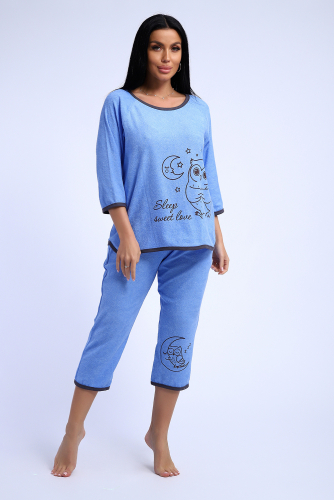 Симпатичный махровый костюм из футболки и бриджей. Футболка с рукавом-реглан длиной 3/4, на полочке изображение совы на фоне луны и звезд. Бриджи свободные, на резинке, с боковыми кармашками, на одной половинке - изображение маленькой совы.