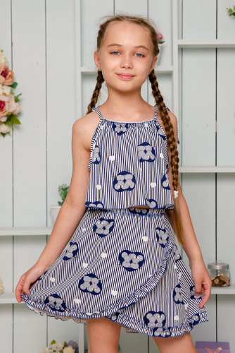 Костюм детский летний с юбкой и топом. Топ свободный на тонких брителях-завязках, которыми удобно регулировать длину изделия, горловина обработана декоративной ажурной резинкой, низ декоративной краеобметочной строчкой. Юбка расклешенная на запах, по всему нижнему контуру настрочена рюша.