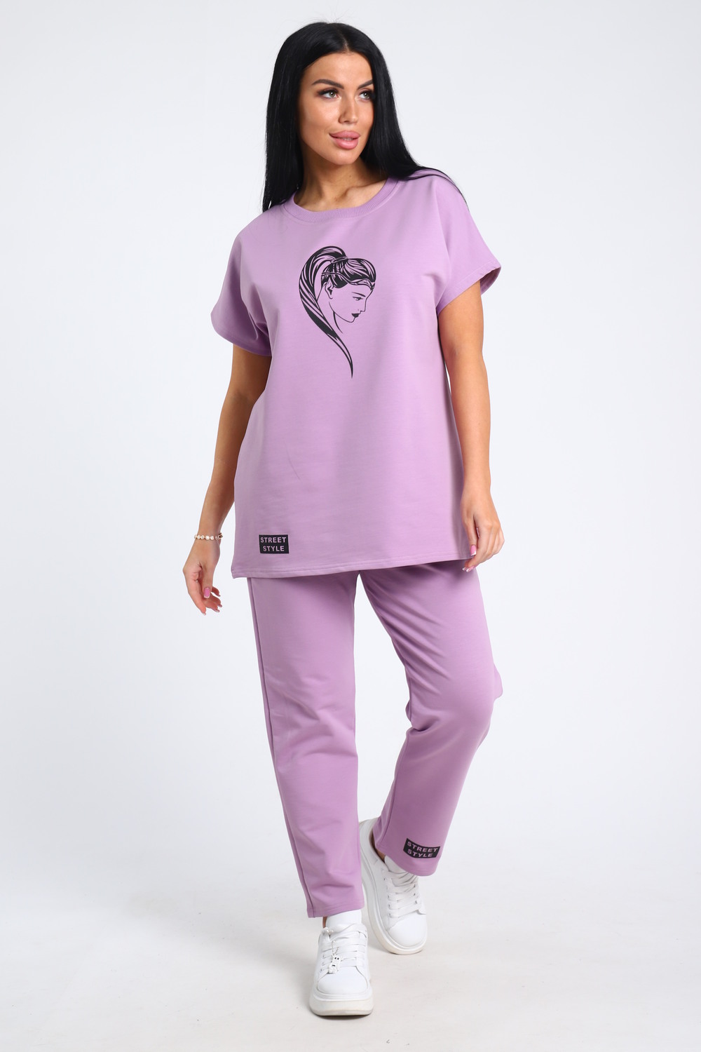 Легкий женский костюм прямого силуэта. Верх двойки - футболка с коротким рукавом и округлой горловиной. Футболка свободная с принтом. Низ - прямые брюки без карманов, пояс на резинке. Данная модель подойдет как и для повседневной носки, так и для дома. Удобный и приятный костюм. Рост модели на фото 165, размер 48.