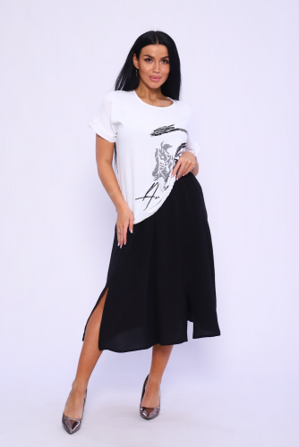 Женская двойка прямого силуэта. Верх комплекта в белом цвете с цветным принтом, короткий цельнокроеный рукав, низ футболки имеет свойство затягиваться, поэтому ее можно носить спущенную на юбку, а можно затянуть и оставить над ней, что подчеркнет вашу талию. Низ - свободная юбка двух цветов, с двумя разрезами снизу. Костюм повседневный и удобный, из легкой ткани сингапур, что хорошо для жаркого лета.