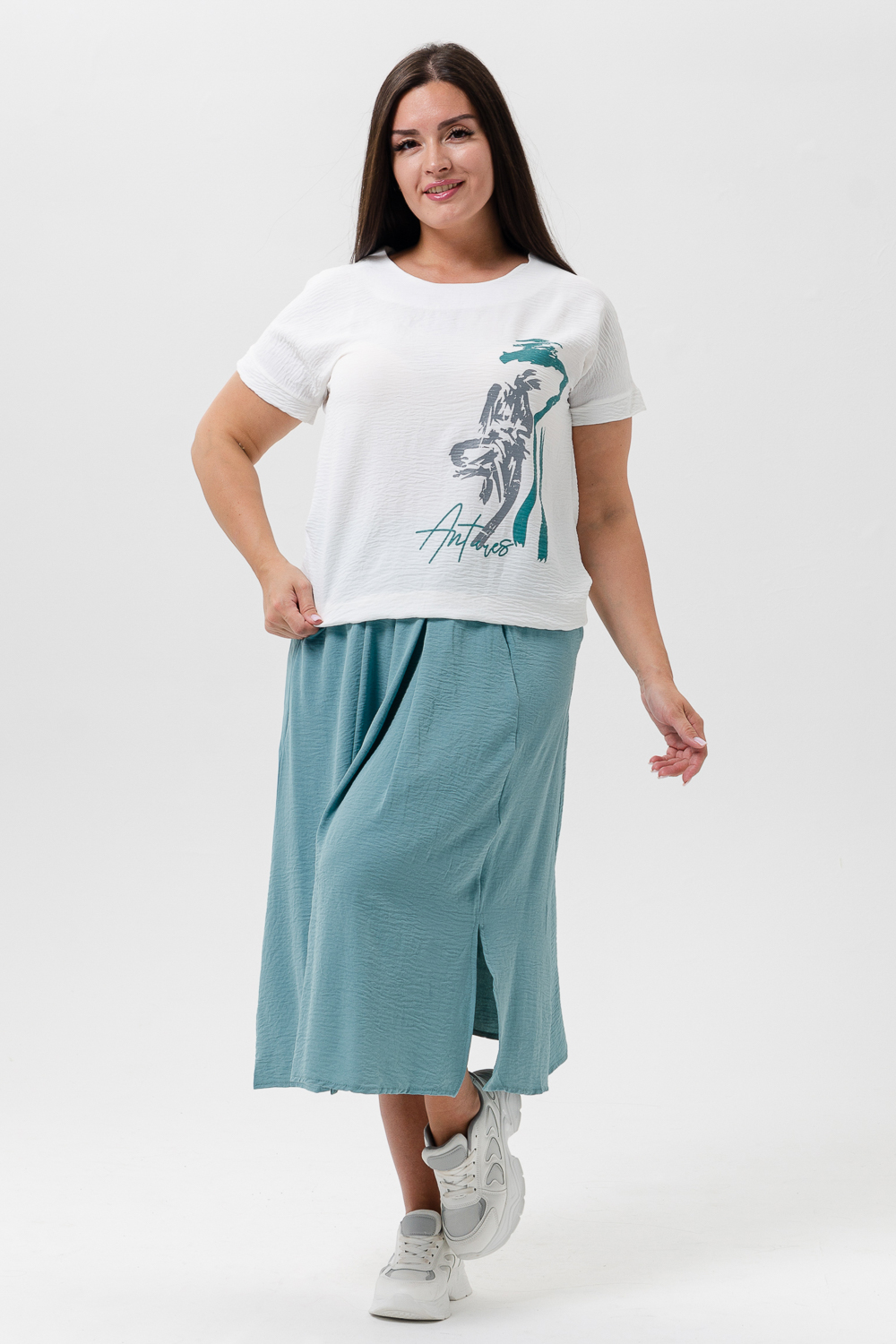 Женская двойка прямого силуэта. Верх комплекта в белом цвете с цветным принтом, короткий цельнокроеный рукав, низ футболки имеет свойство затягиваться, поэтому ее можно носить спущенную на юбку, а можно затянуть и оставить над ней, что подчеркнет вашу талию. Низ - свободная юбка двух цветов, с двумя разрезами снизу. Костюм повседневный и удобный, из легкой ткани сингапур, что хорошо для жаркого лета.