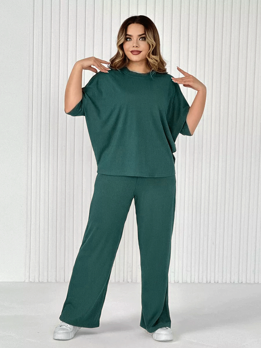 Стильный женский трикотажный костюм из ткани лапши. Комплект состоит из футболки - летучая мышь и брюк широкого кроя с поясом на резинке и карманами по бокам. Модель подойдет для вечернего и повседневного образа, отлично сочетается как с кроссовками, так и с туфлями. Костюм отлично подходит для прогулки, выезда на природу или похода в ресторан. Удобный свободный вверх отличный вариант на лето, приятные к телу штаты удобны и практичны. Длина рукава указана от горловины, а футболка костюма достаточно свободная, поэтому подойдет на любую фигуру. Важно! Подбирая для себя нужный размер, смотрите на замеры брюк.​