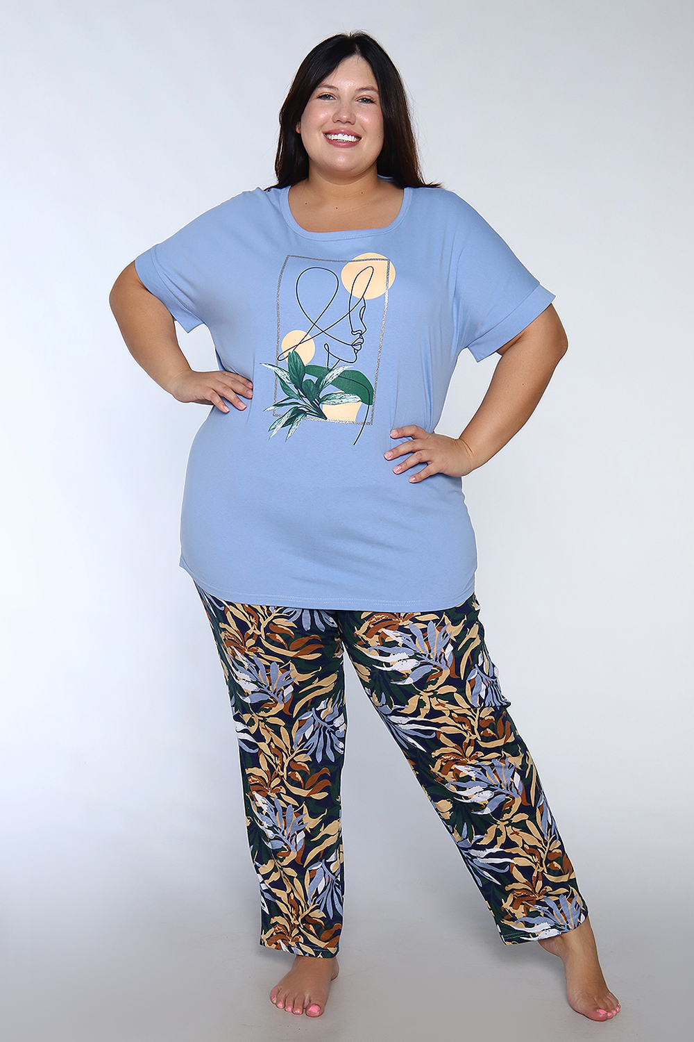Женский костюм состоит из брюк и футболки полуприлегающего силуэта. Костюм выполнен из мягкого трикотажа (100% хлопок). Брюки свободные с двумя боковыми карманами, на широком поясе с резинкой.