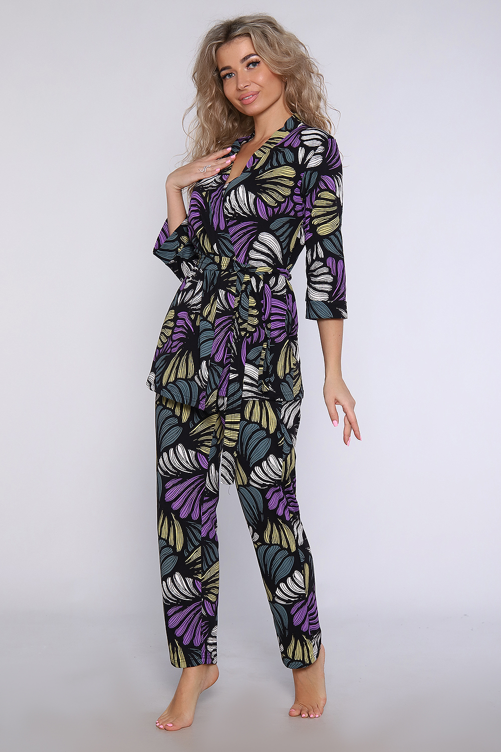 Домашний костюм состоит из укороченного халата и брюк. Брюки прямые с карманами. Халат запашной на поясе. Рукав 3/4 с манжетом. В боковых швах карманы. Удобный и практичный вариант для дома и сна.