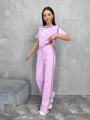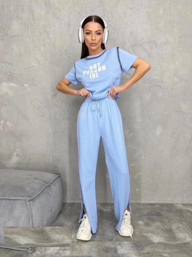 Женский костюм выполнен из футера высокого качества с хлопком и небольшим добавлением полиэстера и лайкры, что позволяет изделию не скатываться и оставлять идеальный внешний вид на долгое время. Костюм состоит из футболки с принтом и брюк с разрезами по бокам. Брюки на резинке с вместительными боковыми карманами.