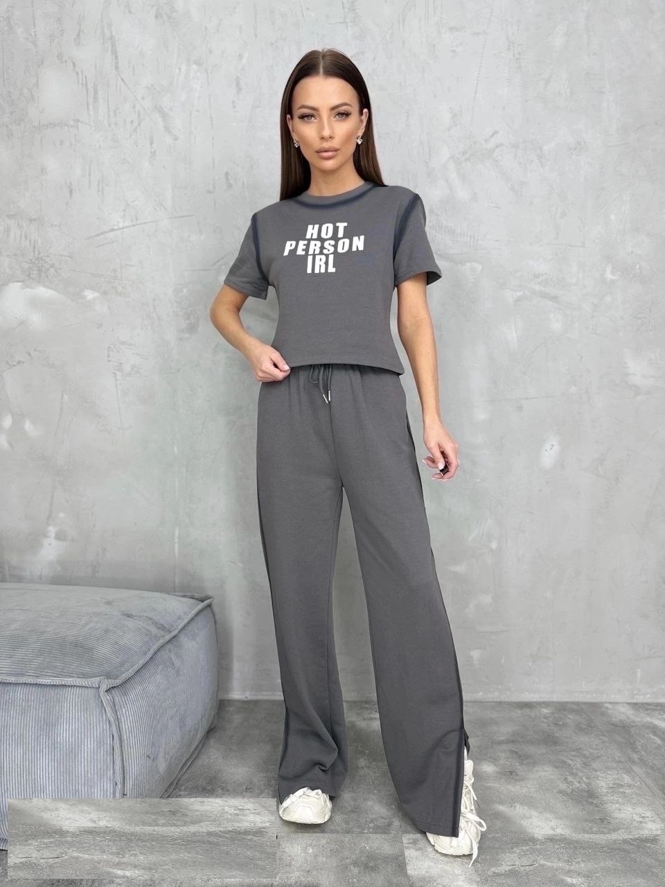 Женский костюм выполнен из футера высокого качества с хлопком и небольшим добавлением полиэстера и лайкры, что позволяет изделию не скатываться и оставлять идеальный внешний вид на долгое время. Костюм состоит из футболки с принтом и брюк с разрезами по бокам. Брюки на резинке с вместительными боковыми карманами.