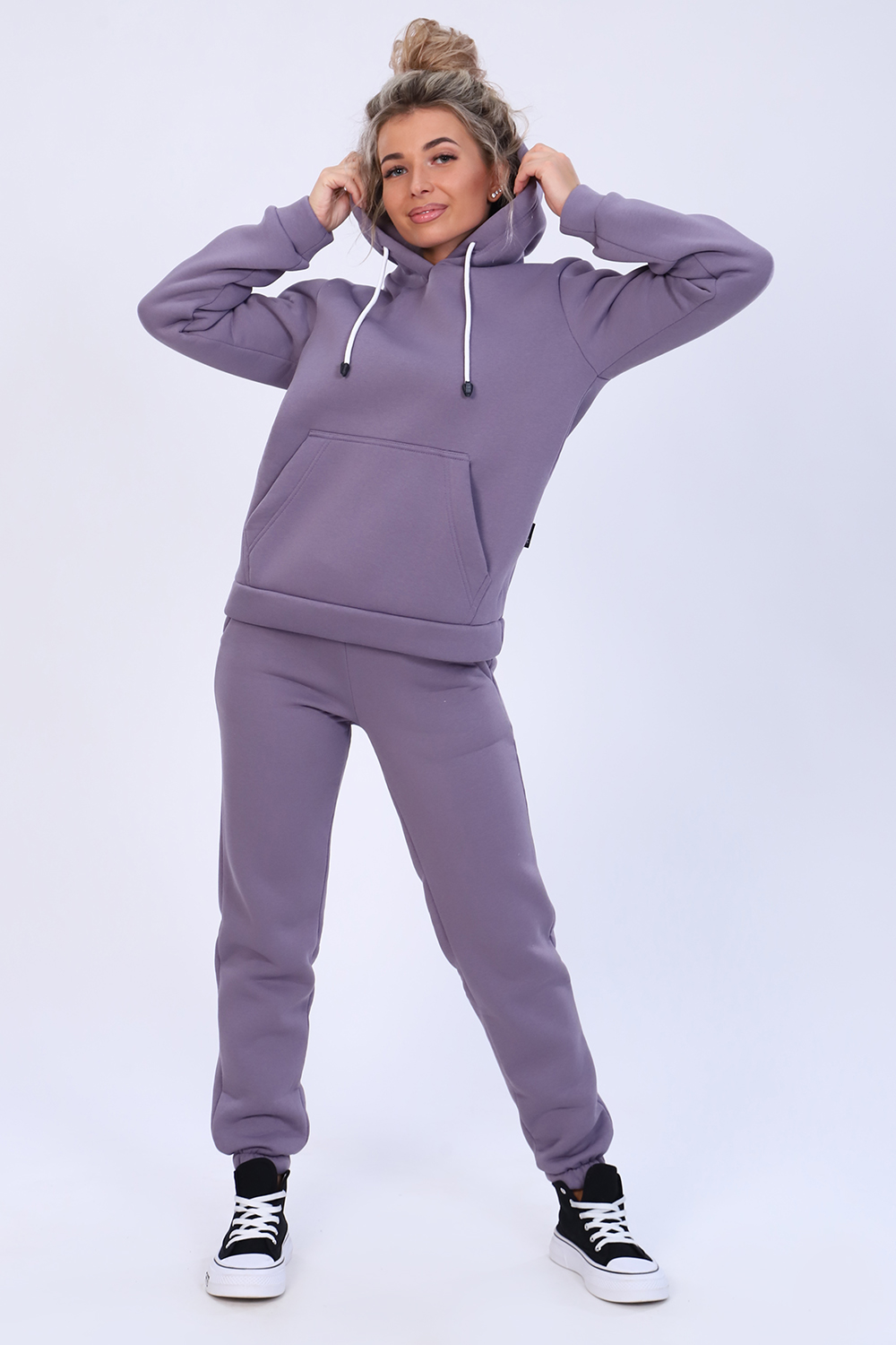 Теплый женский костюм толстовка + брюки. Толстовка с капюшоном, на животе карманы, рукава и низ отделаны манжетами. Брюки с карманами, внизу с манжетами. Несколько вариантов расцветки. Размеры от 44 до 58.