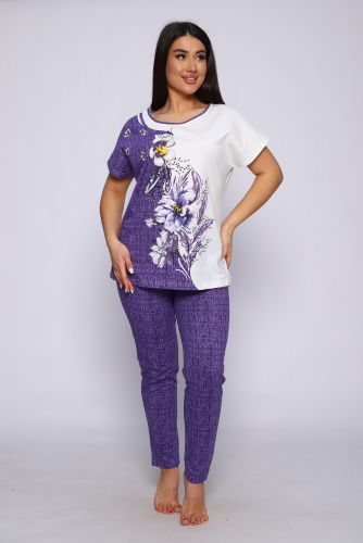 Женский костюм с брюками - идеальный вариант как домашней одежды, костюма для прогулок и путешествий, но так же и как пижама для сна. Для пошива используется ткань со 100% содержанием хлопка. Идеальное лекало костюма позволит подчеркнуть все достоинства фигуры, в то же время модель не сковывают движений и позволяет чувствовать себя комфортно в любых условиях. Особую изюминку изделию придает эффектный дизайн в виде сочетания двух контрастных друг к другу цветов, место стыка которых декорировано изображением прекрасного букета. Так приятно в конце рабочего дня сменить повседневный офисный костюм на такую мягкую и приятную трикотажную одежду!