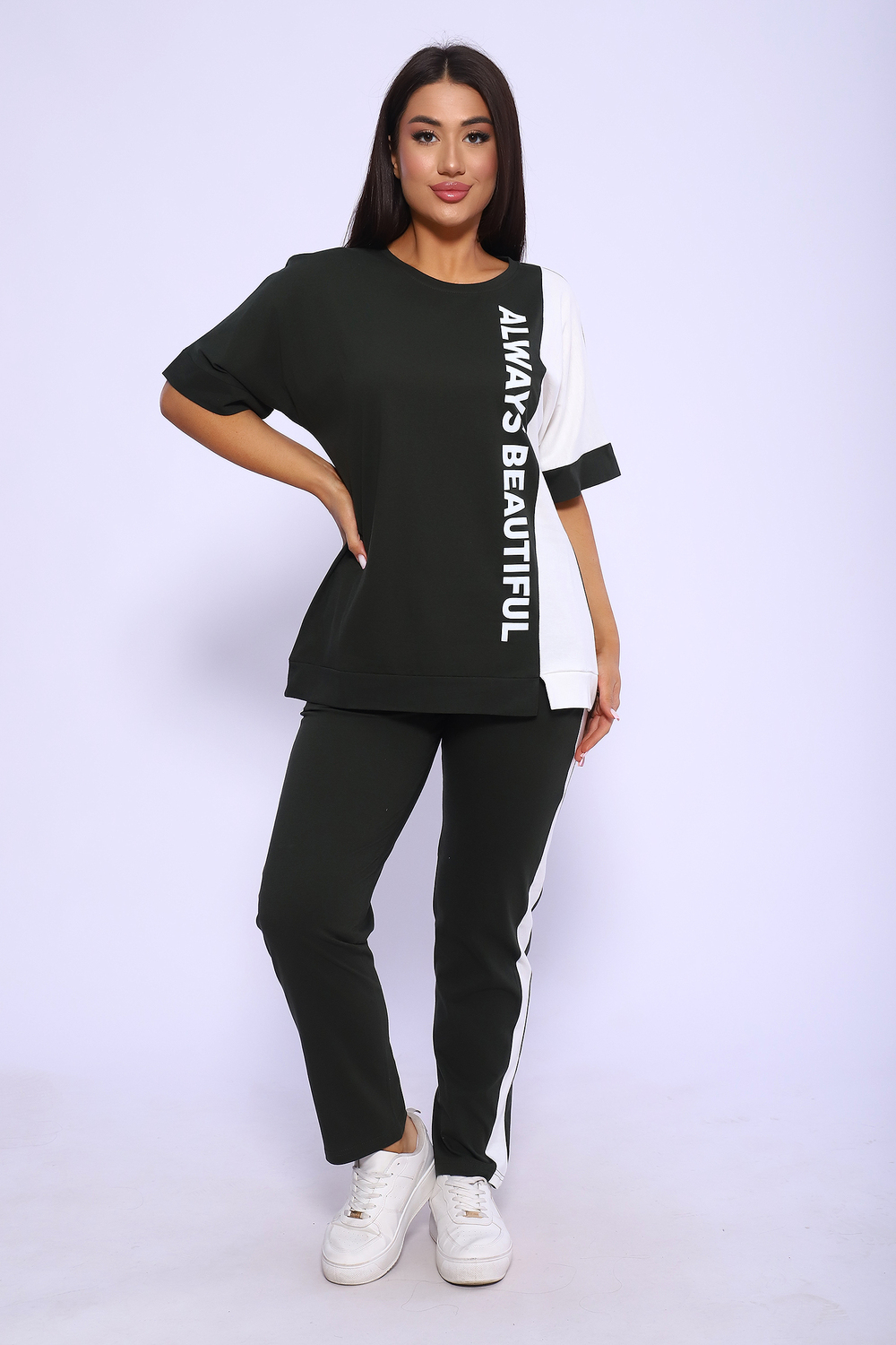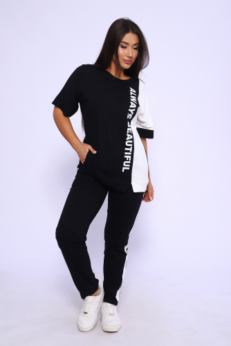 Эффектный костюм в спортивном стиле из трикотажного полотна ярких оттенков. В комплекте представлена кофта свободного кроя со спущенным рукавом и узкие, но не обтягивающие брюки. Изюминкой костюма является сочетание контрастных цветов в дизайне кофты в виде крупных латинских букв и целых вставок. Трикотажные костюмы стали одним из самых популярных и востребованных атрибутов в гардеробе современных женщин, так как не только подчеркивают стиль и индивидуальность, но и обеспечивают комфорт и удобство в повседневной жизни.
