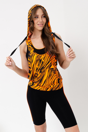 Костюм спортивный женский - тройка, состоит из яркого худи с капюшоном, велосипедок на широком эластичном поясе и укороченного топа со стильным принтом. Подходит для активного отдыха и занятий спортом. Очень удобен для езды на велосипеде.