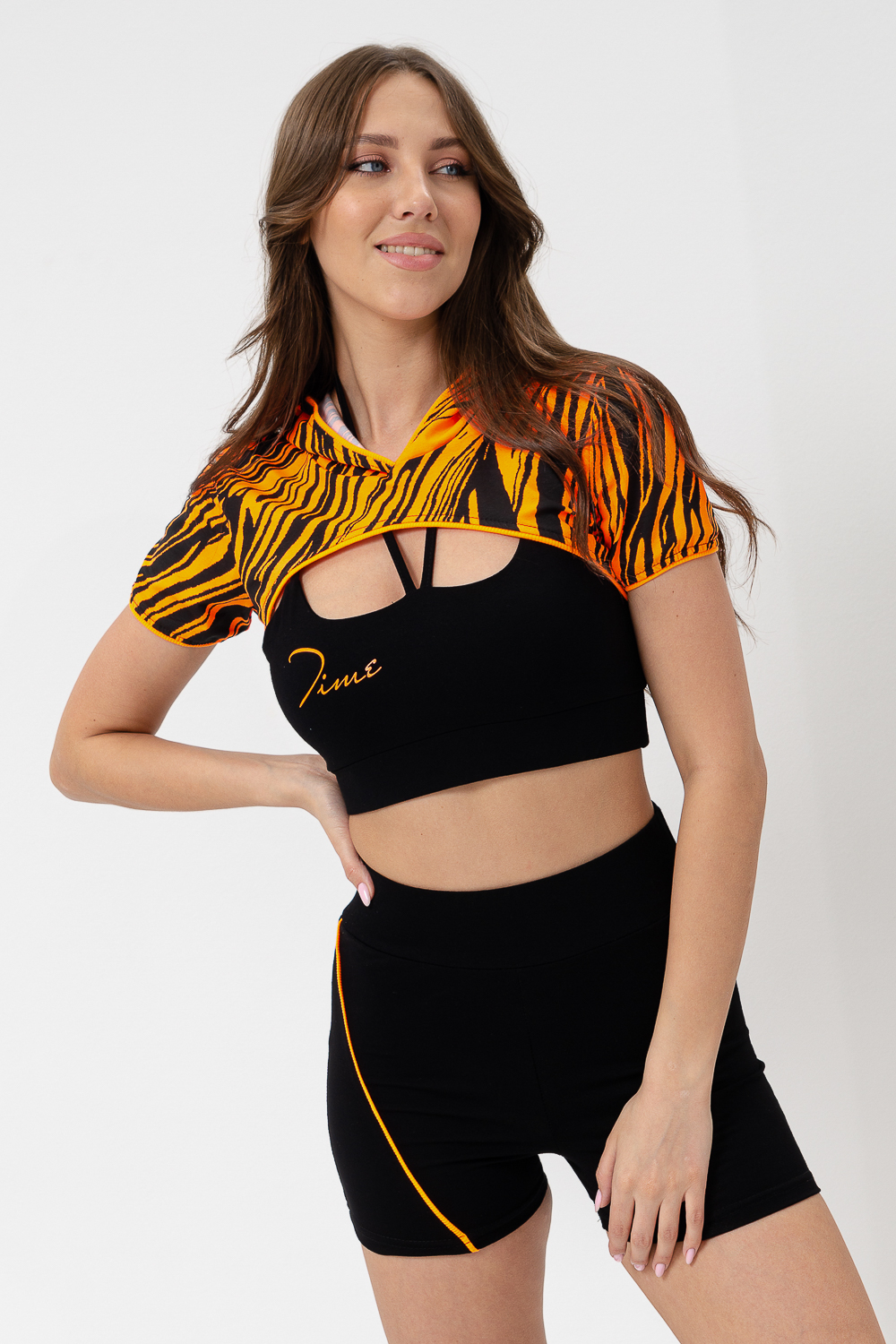 Костюм женский спортивный - тройка, состоит из худи с капюшоном, укороченного топа на тонких бретелях и шорт с широкой эластичной резинкой в поясе.