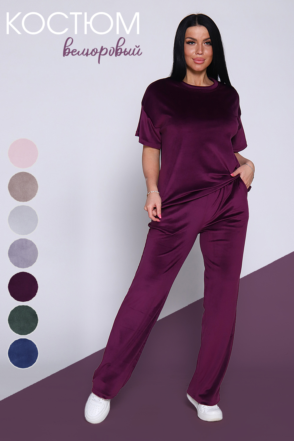 Костюм женский велюровый, повседневный, всесезонный. Костюм состоит из футболки и брюк. Футболка оверсайз прямого силуэта, длиной до бедра. Рукав втачной со спущенным плечом, длиной чуть выше локтя. Горловина с обтачкой, низ футболки с подгибкой. Брюки прямого силуэта, умеренного объема. На передних половинках брюк карманы с отрезным бочком. Пояс притачной с эластичной тесьмой. Низ брюк подгибка. Замеры объема талии брюк по нерастянутой резинке.