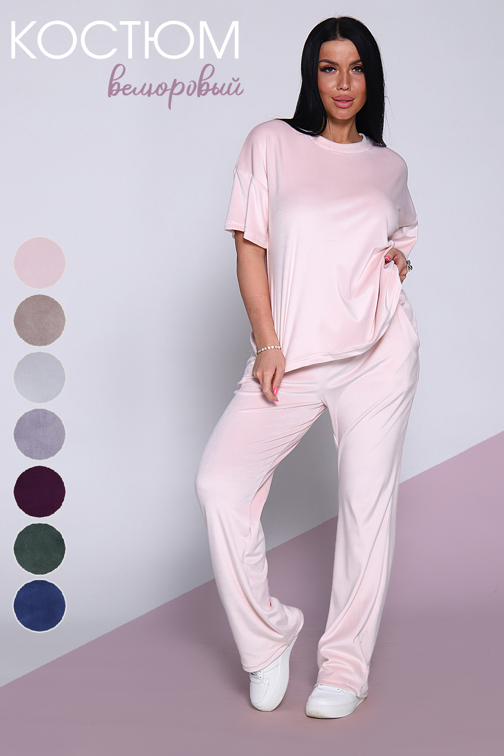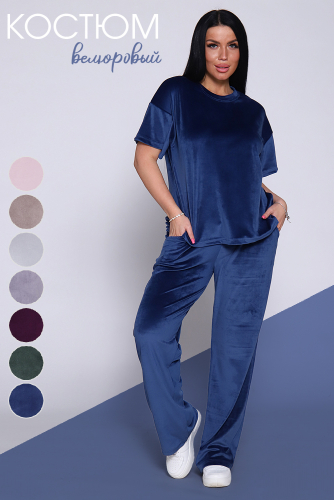 Костюм женский велюровый, повседневный, всесезонный. Костюм состоит из футболки и брюк. Футболка оверсайз прямого силуэта, длиной до бедра. Рукав втачной со спущенным плечом, длиной чуть выше локтя. Горловина с обтачкой, низ футболки с подгибкой. Брюки прямого силуэта, умеренного объема. На передних половинках брюк карманы с отрезным бочком. Пояс притачной с эластичной тесьмой. Низ брюк подгибка. Замеры объема талии брюк по нерастянутой резинке.