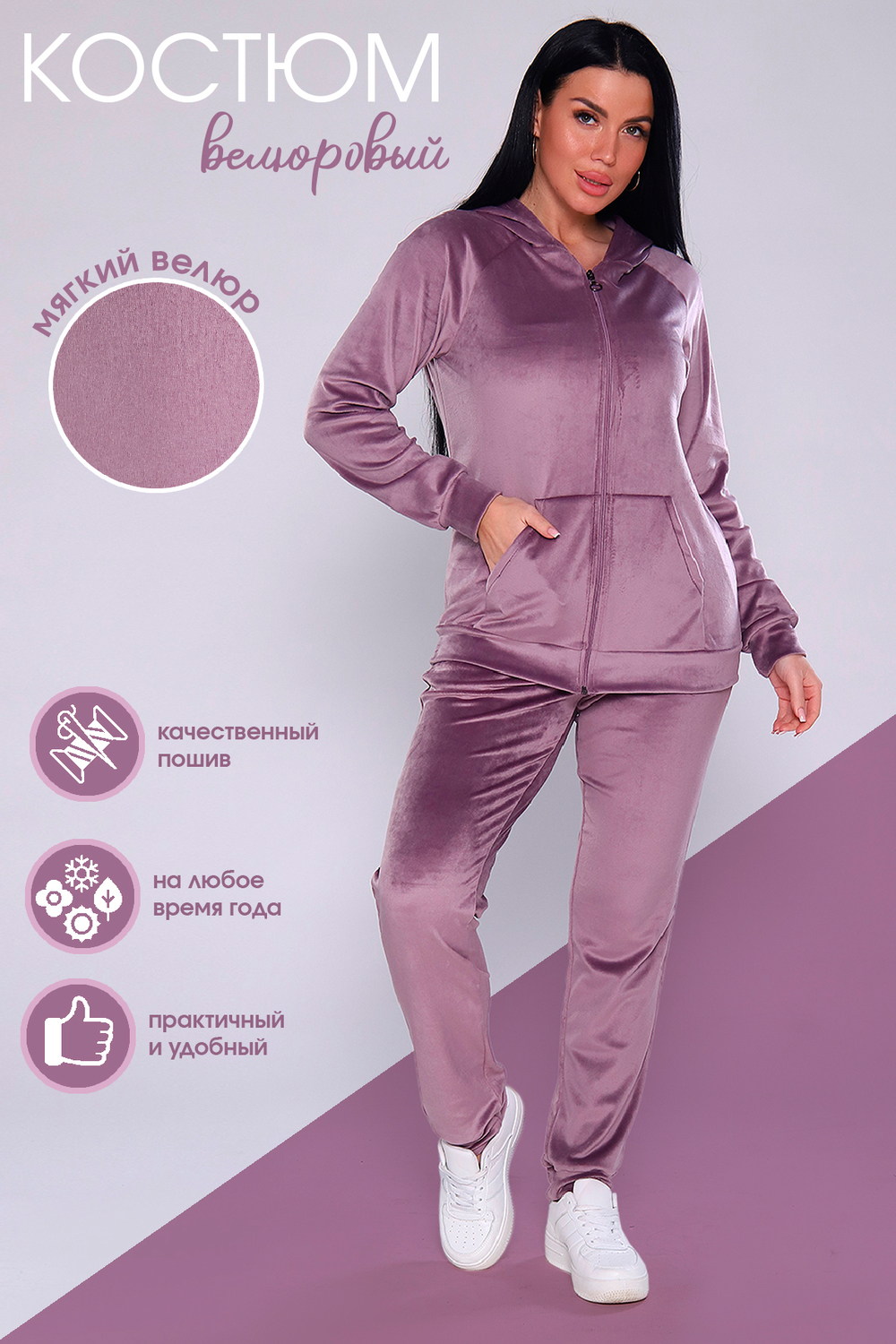 Костюм женский велюровый, повседневный, всесезонный. Костюм состоит из толстовки и брюк на широкой резинке. Толстовка на молнии, с двойным капюшоном, и с карманами кенгуру. Брюки - джоггеры на манжетах, карманы с отрезным бочком. Костюм универсальный, для прогулок, для занятия фитнесом, для дома. Замеры талии на брюках производятся по не растянутой резинке.
