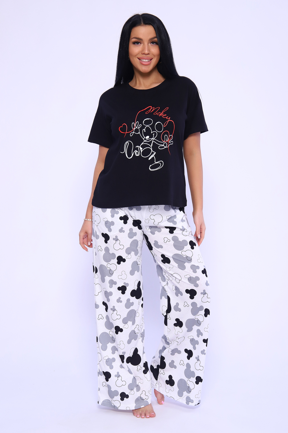 Женский домашний костюм-пижама, состоящий из футболки и брюк Микки из трикотажного полотна 100% хлопка. Приятный дышащий материал идеален для изготовления домашней одежды. Футболка свободного кроя, с круглой горловиной и втачным спущенным коротким рукавом, в которой будет одинаково приятно спать и заниматься домашними делами. Оригинальный, яркий принт обязательно поднимет настроение. Брюки прямого силуэта свободного кроя, с карманами в боковых швах. Мягкий удобный пояс на резинке не перекрутится, т.к отстрочен на поясной машине. Пижамка не изменит свой внешний вид после стирки при соблюдении рекомендаций по уходу и будет долго вас радовать. Отличный подарок для всех девушек и женщин на любой праздник!