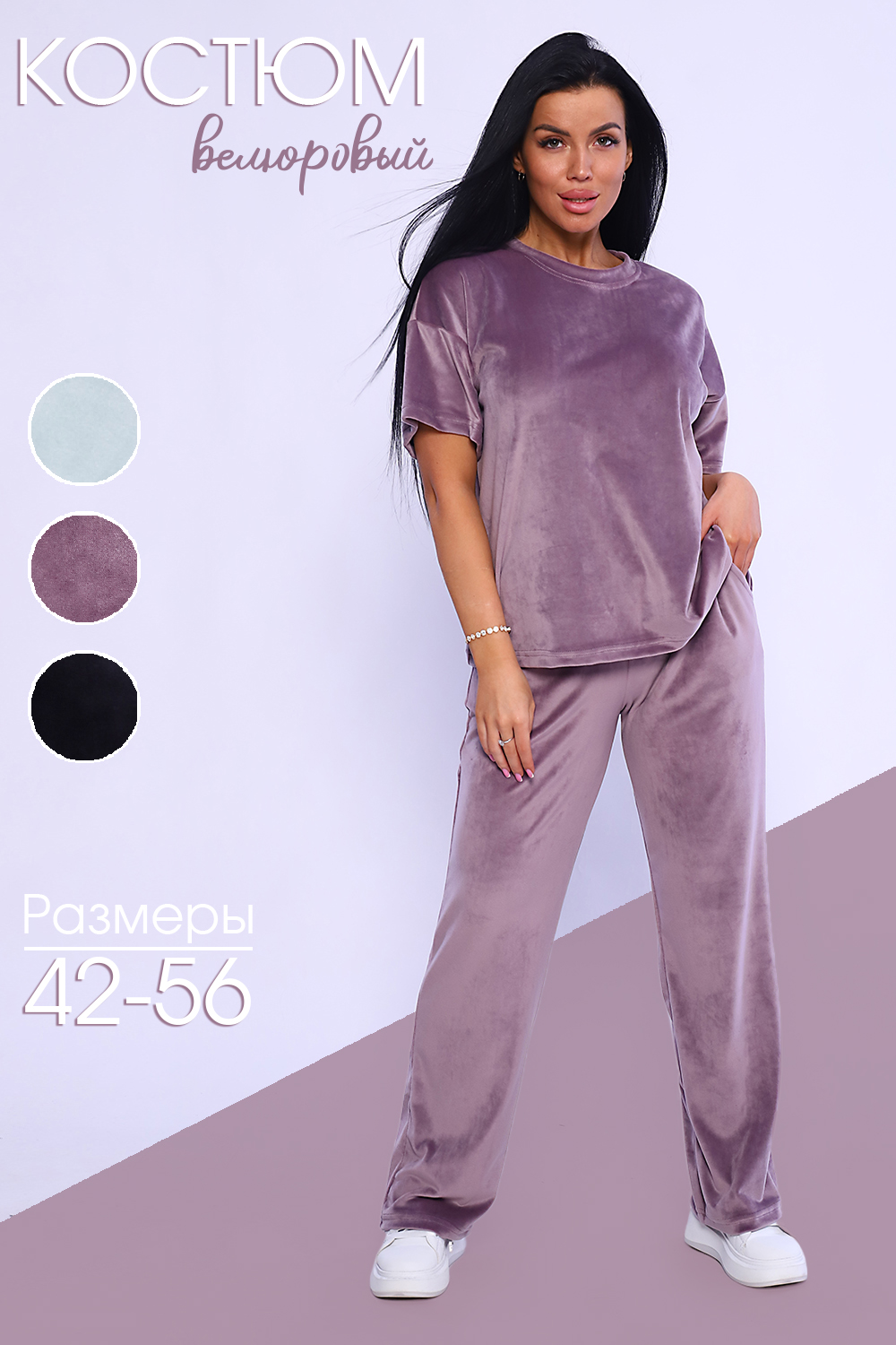 Костюм женский велюровый, повседневный, всесезонный. Костюм состоит из футболки и брюк. Футболка оверсайз прямого силуэта, длиной до бедра. Рукав втачной со спущенным плечом, длиной чуть выше локтя. Горловина с обтачкой, низ футболки с подгибкой. Брюки прямого силуэта, умеренного объема. На передних половинках брюк карманы с отрезным бочком. Пояс притачной с эластичной тесьмой. Низ брюк подгибка. Замеры объема талии брюк по нерастянутой резинке.
