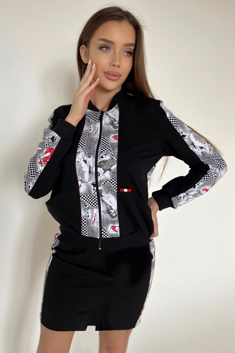Костюм женский из кофты и юбки. Кофта на молнии с двумя карманами. Спереди на юбке шлица, сзади кармашек с флажком.