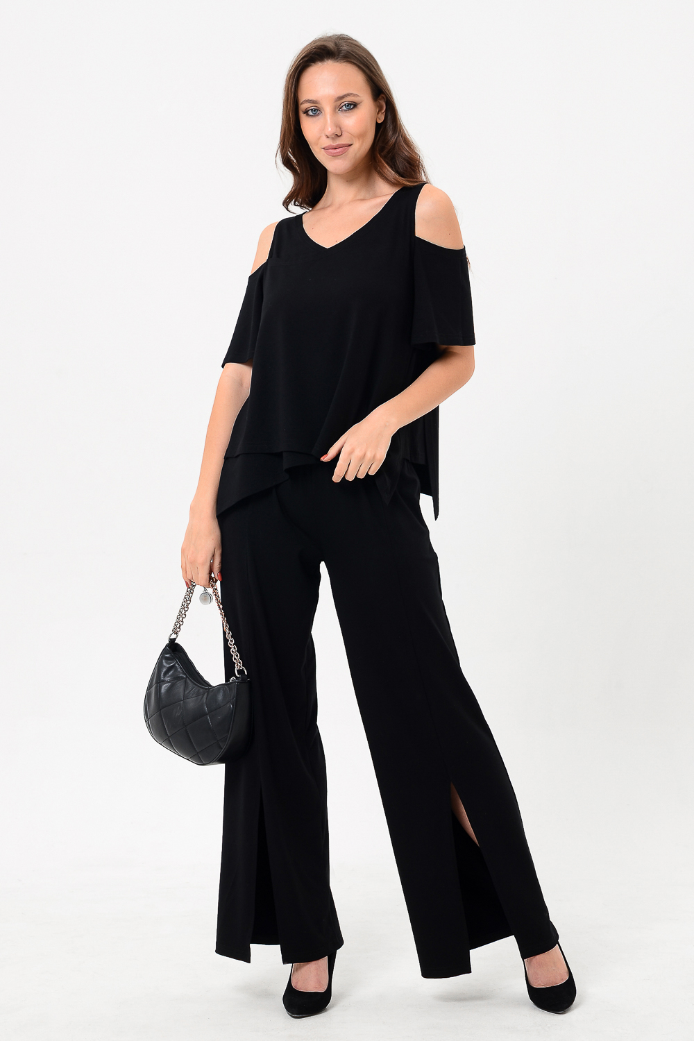 Костюм женский свободного силуэта. Рукав с открытым плечом. Брюки с разрезами по низу. Прекрасно будет смотреться на праздничном вечере