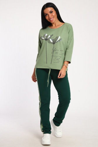 Костюм женский выполнен из футера с лайкрой. Состоит из кофты без карманов и брюк прямого силуэта с лампасами. Кофта имеет внизу регулировку, что позволяет затягивать или оставлять или оставлять кофту свободной. У костюма широкий размерный ряд.