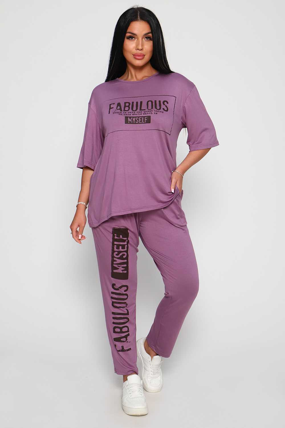 Костюм из вискозы, состоит из футболки и брюк. Футболка свободная, рукав до локтя, горловина обработана под окантовку по переду принт. Брюки по переду со складками, с карманами с принтом на одной брючине, длина до щиколотки. На модели 48-50 размер.